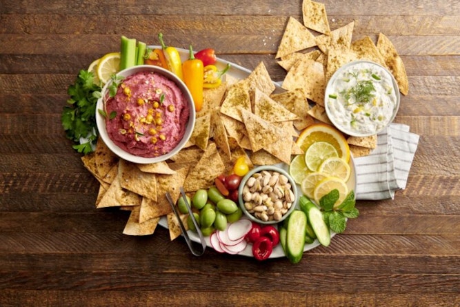 - Serve baked Za’atar tortilla chips on a large appetizer board along with Beet Hummus, tzatziki sauce, and an assortment of fresh and pickled vegetables, citrus, fresh herbs, etc.