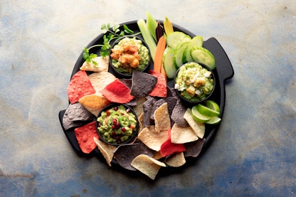 • Three piles of tortilla chips are arranged side by side on a white background: one pile is blue, one is red, and one is white.