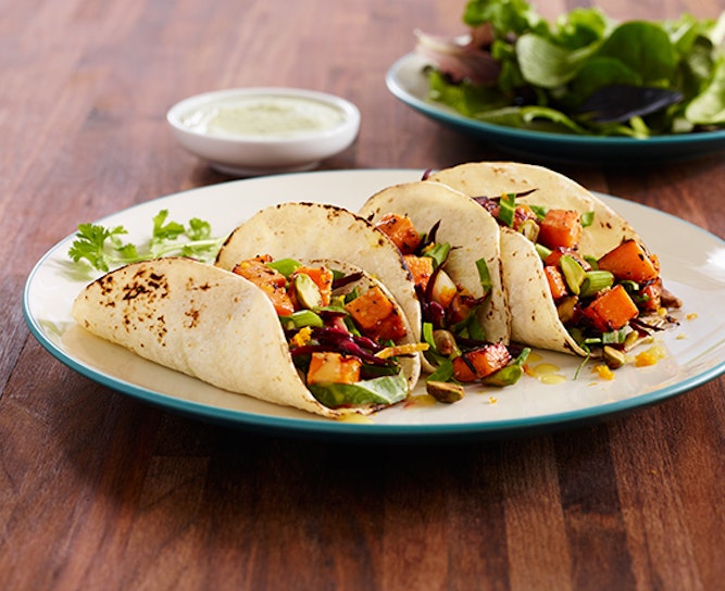 - To assemble: warm tortillas, and place ¼ cup of Orange Beet Slaw in the bottom. Top with 2 oz. of shichimi togarashi spiced sweet potatoes, and 1 tbsp. of Miso-Lime Aioli. Serve 2 per order.