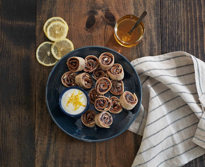 - To prepare one pinwheel, lay the tortilla on a clean work surface. Evenly spread 2 oz. almond butter, sprinkle 1tbsp. almond pieces, and drizzle with 2 oz. Blueberry and Chia Jam.