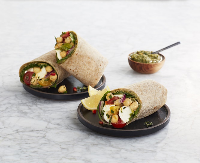 - To build wrap, spread one tortilla with 3 tbsp. of the almond pesto, and top with 1 ½ oz. grape tomatoes, ¼ cup red onion slices, ¾ oz. baby spinach greens, 1 oz. mozzarella pearls, and ½ cup of the Citrus Marinated Chickpeas.