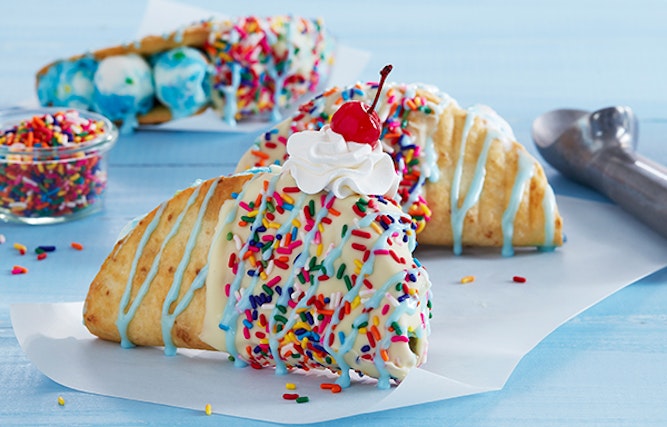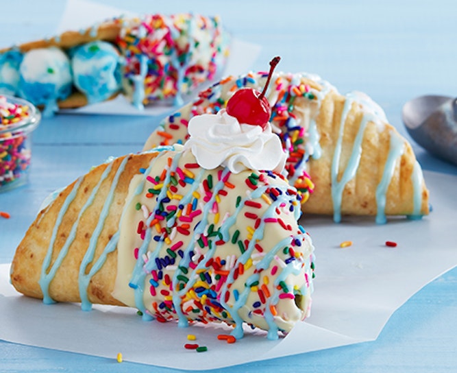 - Fill taco shells with 6 oz. of birthday cake ice cream and then let freeze until firm.