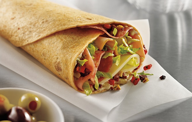 - Lay 2 slices of turkey in the middle top half of the wrap followed by 1 slice of provolone, 1 slice of mortadella and 2 slices of salami. Top the stack of meat and cheese with 1 oz. (1/2 C) of shredded iceberg lettuce, fold the bottom half up and then fold in each side to form an open ended wrap.