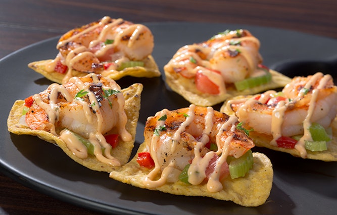 - To assemble one portion: arrange 16 chips (1.6 oz.) on a plate. Layer each chip with one butterflied shrimp half, 1 tsp. each of the celery, onion, pepper, and tomato, then drizzle with 1 tsp. of the cheese sauce. Garnish with parsley and serve immediately.