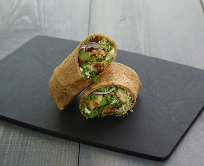 - To make one wrap, spread 1 oz. mayonnaise on a wrap and top with 3 ½ oz. chicken, ½ oz. bacon, 1 oz. avocado, ½ oz. sprouts, ½ oz. lettuce, and ¼ oz. red onion. Roll, folding in one side to create a wrap.
