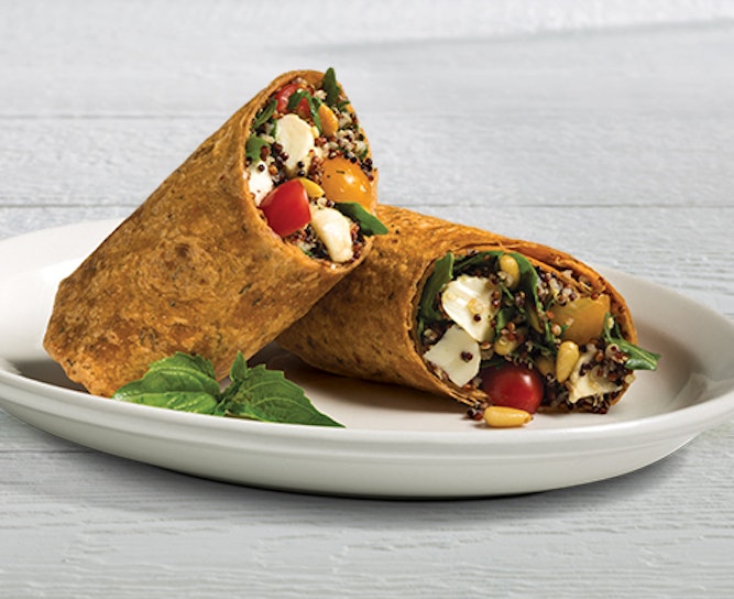 - To make each wrap, combine 1 cup quinoa, ¼ cup grape tomatoes, ¼ cup mozzarella, 2 tbsp. pine nuts, 2 tbsp. Basil-balsamic Vinaigrette and 1 cup arugula greens. Place one Tomato Basil Wrap on flat work surface, fill with quinoa mixture and roll tightly burrito-style. Cut in half to serve.