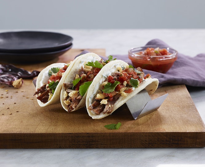 - To assemble one taco, top a tortilla with 1 oz. Shredded Pork ½ tbsp. crushed chicharrones, 1 tbsp. Cilantro Lime Yogurt, 1 tbsp. Salsa Roja, and garnish with 1 tsp. queso fresco crumbles. Serve two tacos per order.
