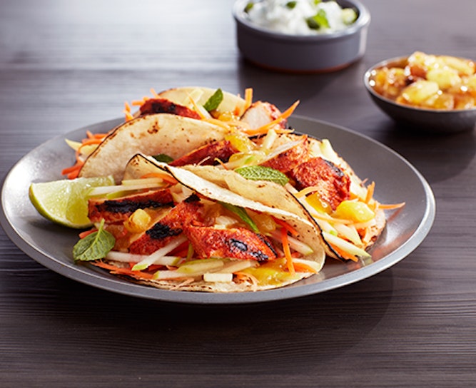 - Place shredded carrots and apples in center of tortilla. Top with Tandoori Grilled Chicken Strips.