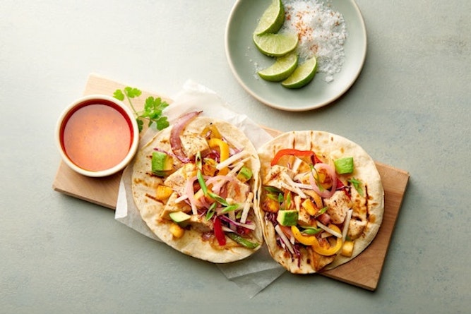 - Grill tortillas on both sides and then fill each with about 3 oz. of diced chicken with vinaigrette.