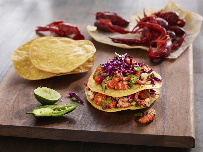 - Place corn tortillas on a plate, add crawfish mixture, then top with cabbage mixture. Repeat. Garnish with whole roasted jalapeño pepper and whole crawfish.