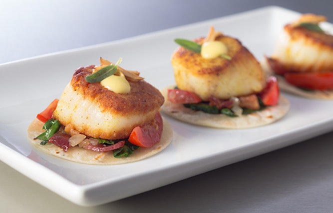 - To assemble: on each tortilla round, start with 1½ tbsp. Swiss chard and tomato mix. Top with one scallop each, ½ tsp. corn puree, fried garlic crisps, and one fried sage leaf for each scallop. Serve immediately.