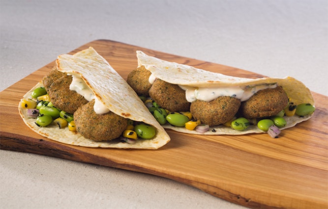 - To assemble, on each tortilla, layer 4 falafel patties and top with 2 tbsp. of corn salsa and 1 tbsp. of sesame yogurt sauce. Serve immediately.