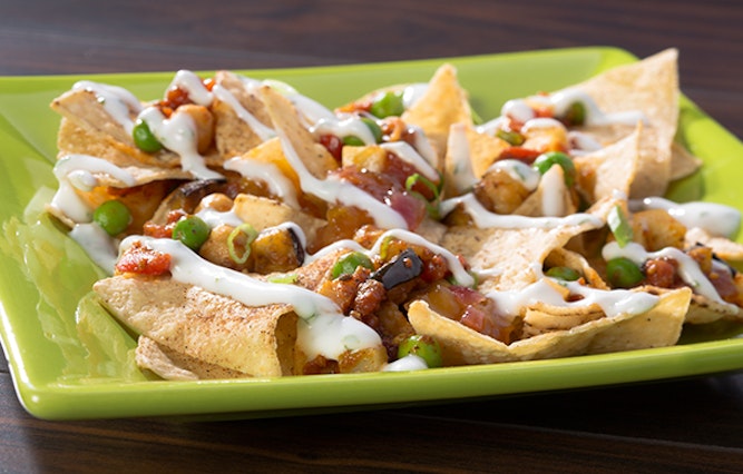 - To assemble one portion: arrange 2.5 oz. of chips on a plate and top with ¾ cup of curry sauce, ¼ cup mango chutney, 2 tbsp. drizzle of yogurt sauce, and sprinkle with scallions. Serve immediately.