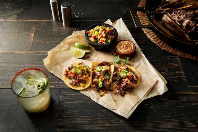 - Spread 2 tsp. chipotle aioli over each tortilla, top each with 1 oz. warm Kahlua pork, 1 tbsp. charred pineapple salsa, 3 red onion slices, and 2 jalapeño coins. Serve with lime wedges.