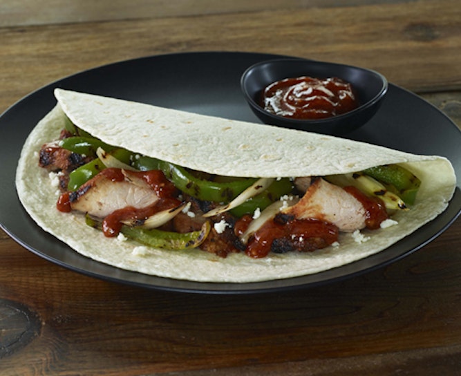 - To make one fajita, top one tortilla with 4 oz. sliced ribs, 1 ½ tbsp. Memphis Style BBQ Sauce, ¾ oz. onions, ¾ oz. peppers, and ½ oz. queso fresco.