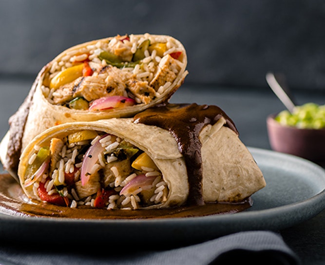 - To prepare single serving, place 1 warm wrap on work surface. Top center of wrap with ¾ cup warm brown rice, and layer with 3 oz. grilled chicken slices, ¾ cup grilled vegetables, and ¼ cup (2 oz. ladle) of red mole sauce. Roll into a burrito and serve with another ¼ cup (2 oz. ladle) of red mole smothered over top. Serve immediately.