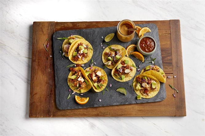 - To build each taco: on one warm tortilla, spread 0.3 oz of creamy Peanut Butter, place 0.5 oz of roasted chicken thighs, 0.5 oz of avocado chunks, 0.1 oz of red onion, 0.1 oz of salsa roja and garnish with cilantro leaves.