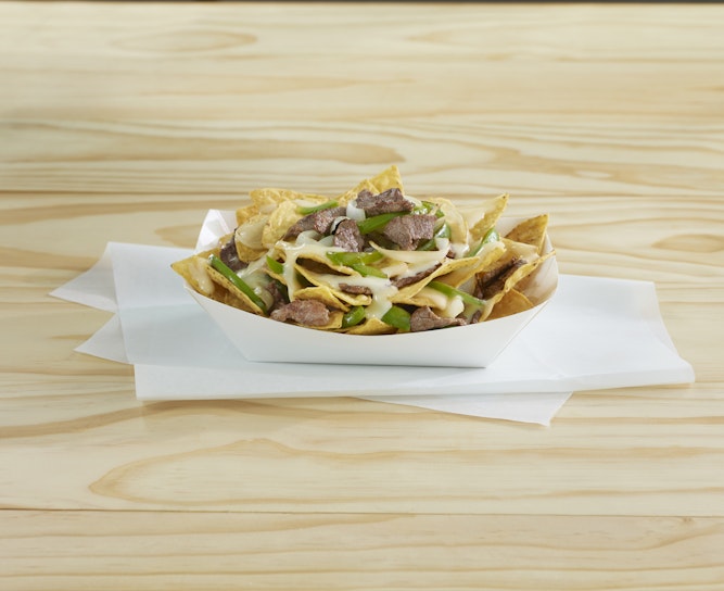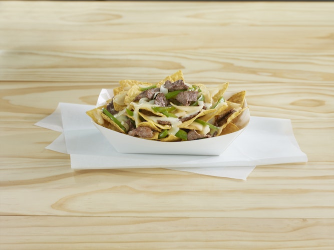 - To serve, add 16 chips to a plate and top with 6 oz. of the steak mixture. Drizzle with ½ cup White Cheddar Cheese Sauce. Serve immediately.