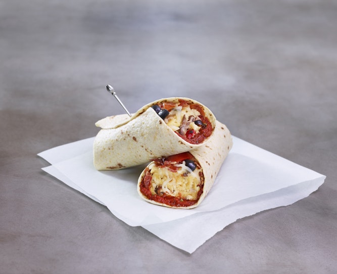 - To assemble one wrap, spread 1 oz. marinara over a tortilla, followed by polenta with cheese, ½ oz. crispy prosciutto, ½ oz. black olives, and ½ oz. marinated tomatoes. Roll, folding in one end to create a wrap.