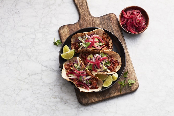 - To prepare one taco, top one warmed tortilla with ¼ cup of BBQ Bourbon Pulled Jackfruit, ¼ cup of the Jicama Slaw, 1 tbsp. pickled red onion and serve with a lime wedge.