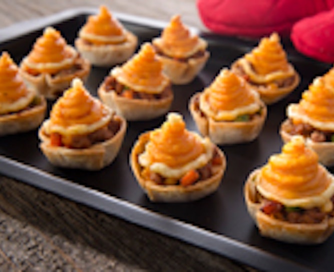 - Using a 3” round cutter, cut rounds out. Pan spray a mini-muffin tin and place one round into each mini-muffin holder. Fill each tortilla with a little less than 1 tbsp. of the lamb mixture. Using the filled piping bags, pipe a 1” high cone shape with the sweet potato mixture. Ring the base of the cone with russet potato mixture and place a dot of russet potato mixture on the very top to complete the Santa hat. Bake in the oven for 10-15 minutes, or until heated through, and the tortilla is crisp.