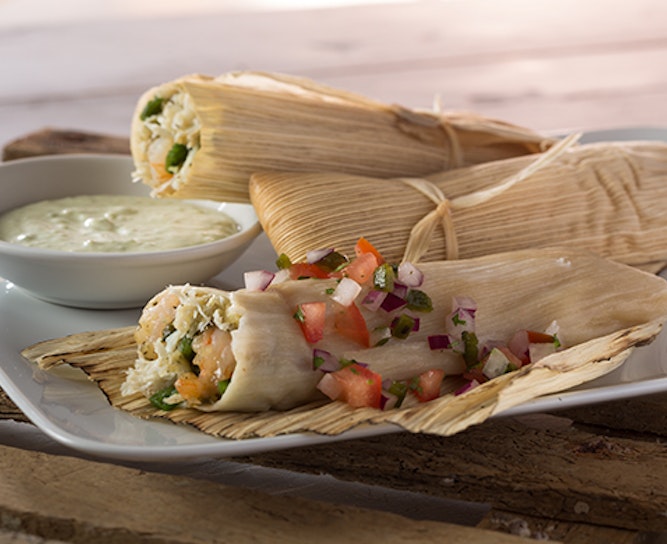 - To serve: Unwrap two of the tamales and top with 2 oz. roasted poblano sauce and 2 tbsp. pico de gallo. Optionally, place steamed corn husks under a broiler until lightly charred and serve tamales over top.