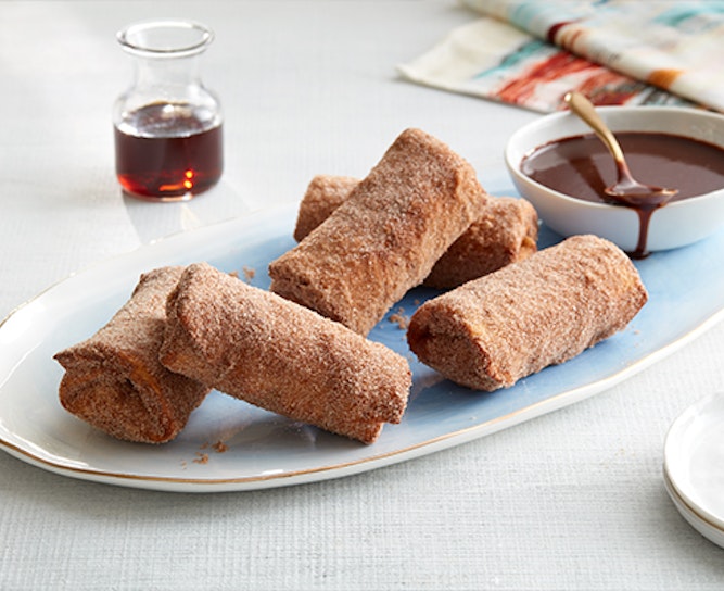 - To serve, plate 3 French Toast Roll-ups and serve with a ramekin of warmed Mexican Hot Chocolate Dipping Sauce.