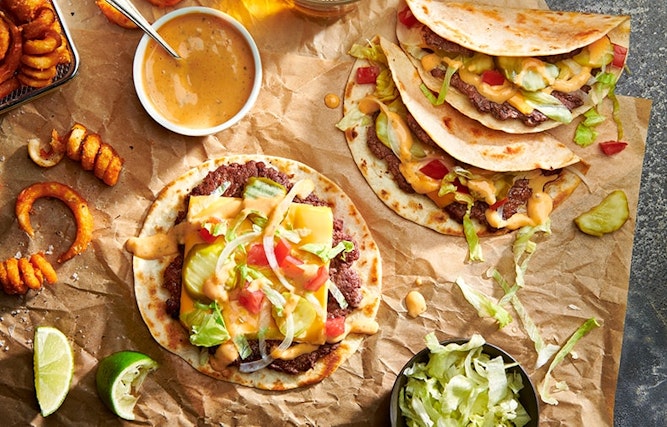 - Top each taco with a 3-finger pinch of shredded lettuce, shaved onion, diced tomato, and diced pickles. Drizzle with house burger sauce and serve.