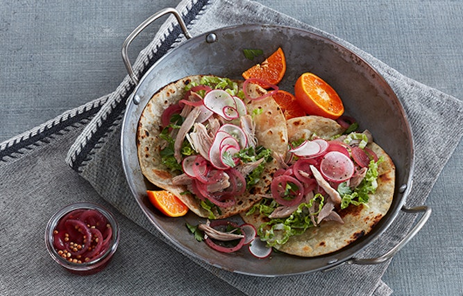 - Top each cooked tortilla with 1 ½ oz. Smoked Duck Carnitas, 2 tbsp. Cabbage Slaw, and 3 radish slices.