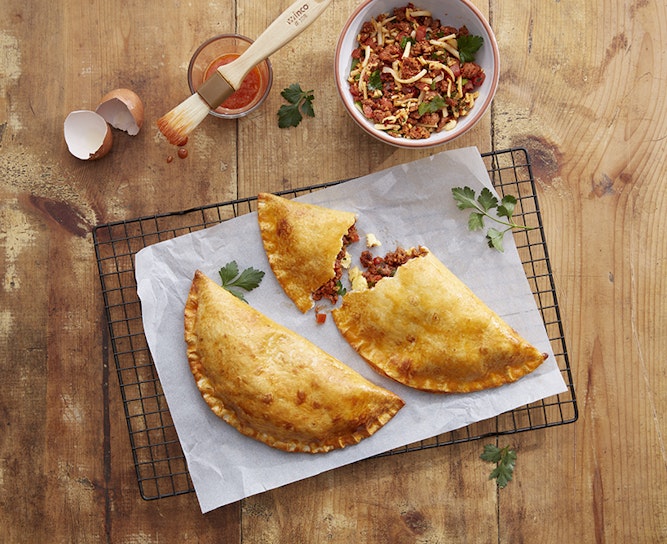 3. Fold half of the tortilla over and brush inside edges with egg white, crimping the edges to seal into a hand-pie.