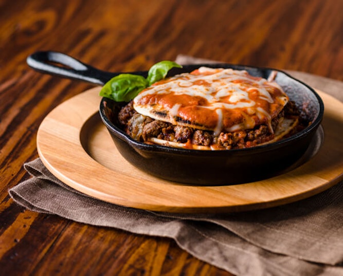 - To make lasagna quesadilla stacks, assemble in individual baking dishes such as a 6" cast iron pan. Spread out 2 oz. ladle of tomato basil cream sauce in bottom of each dish and top each with 1 tortilla, ¼ cup smoked mozzarella, ¼ cup ground beef, and then repeat layer 1 more time. Finish each with a final tortilla, 2 oz. ladle of sauce, and ¼ cup smoked mozzarella cheese.