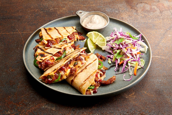 - Cut quesadillas in half and serve 4 cut pieces per serving with a side of slaw and Bourbon BBQ sour cream for dipping.