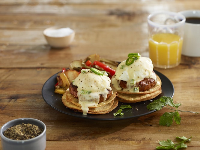 - TO ASSEMBLE: Place 2 of the tortillas in the center of the plate. Place one chorizo patty on each tortilla. Using a slotted spoon place one egg on each of the patties. Finish by topping the eggs with the hollandaise and surround the benedict with the potatoes. Garnish with a cilantro leaf and serve.