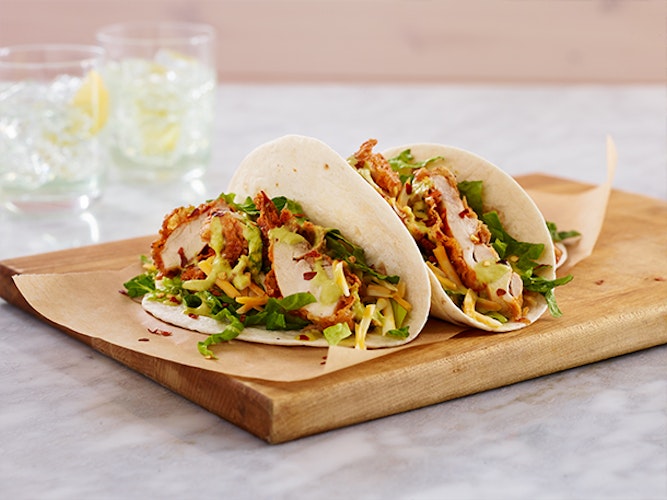 - To assemble each taco, place a fried chicken strip into a warmed tortilla and top with ½ oz. of romaine lettuce, ½ oz. of shredded cheese and 2 ½ tbsp. of Spicy Poblano Avocado Sauce. Serve two per order.