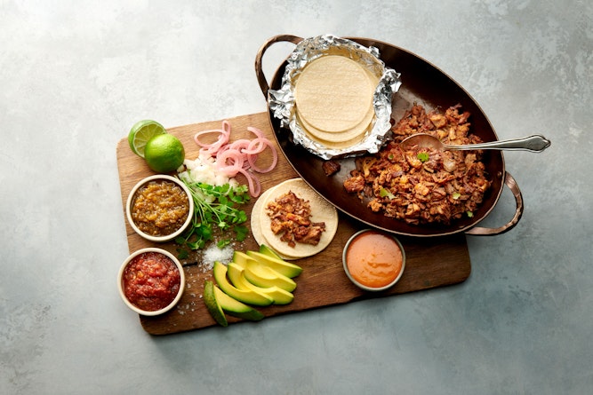 2. On a large serving board lay out the tortillas and fill with 1 oz of warmed Campechanos Meat.