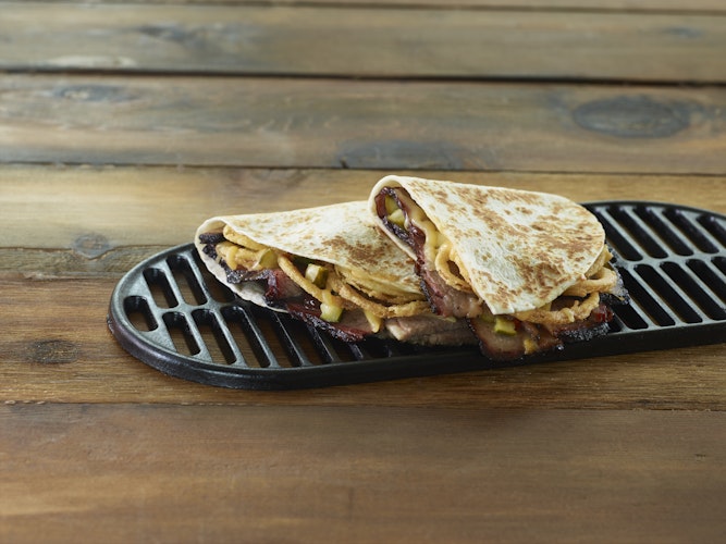 - Spread 1 oz. of BBQ sauce on a tortilla. Top one half of the tortilla with 3 oz. brisket, 1 oz. shredded cheese, ½ oz. Crispy Onions, and 1 tbsp. chopped pickles.