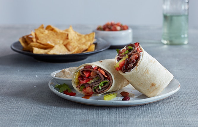 - To make one burrito, lightly warm tortilla and top with 2 tbsp. of Smoked Aioli, 2 oz. of seared Beef Bacon, ½ cup smoky baked beans, 3-finger pinch of Arugula, 2 tomato slices and 3 dill pickle slices.