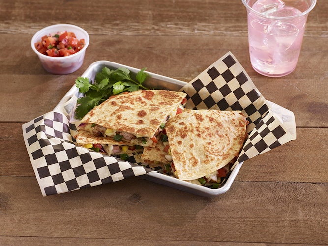 - To assemble one quesadilla, on an 8” Mission® Flour Tortilla, layer 1 oz. shredded cheese, 3 oz. sliced pork, ½ oz. fresh corn, 1 oz. pico de gallo, and an additional 1 oz. of shredded cheese. Top with a second tortilla and griddle or press until cheese has melted.