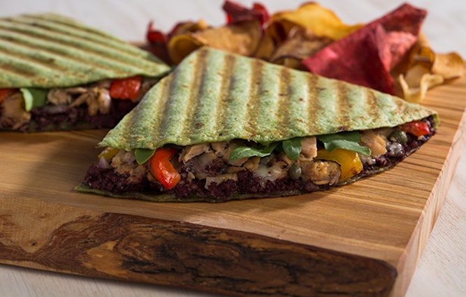 - To serve: Spread 1 2/3 tbsp. Kalamata tapenade on top half of tortilla. Plate 0.25 oz of arugula on bottom half, top with 3.0 oz tuna mix and 0.5 oz roasted bell peppers, top with 0.5 oz. cheese. Fold top half down to create half-moon shape, and place on panini press for 3-5 minutes or until warm and cheese melts. Cut in half and serve.